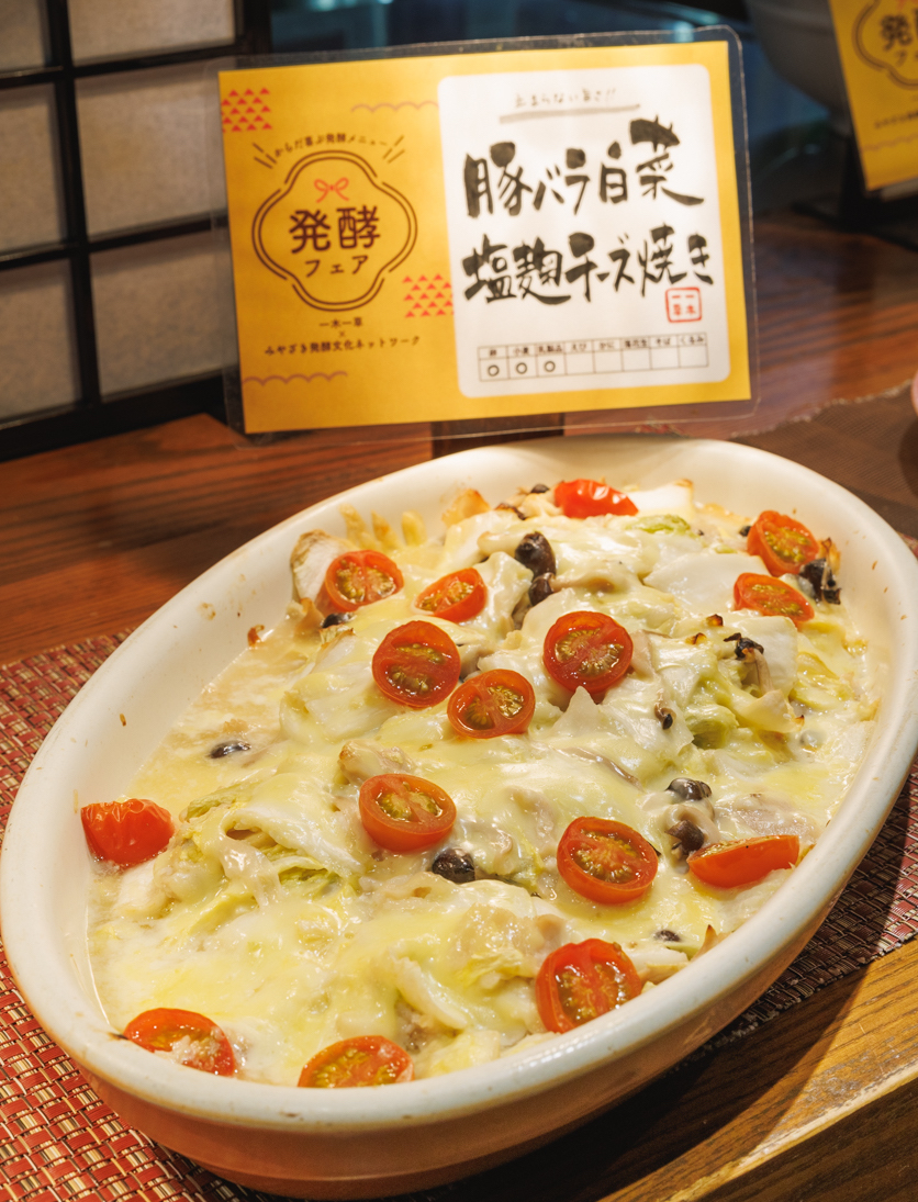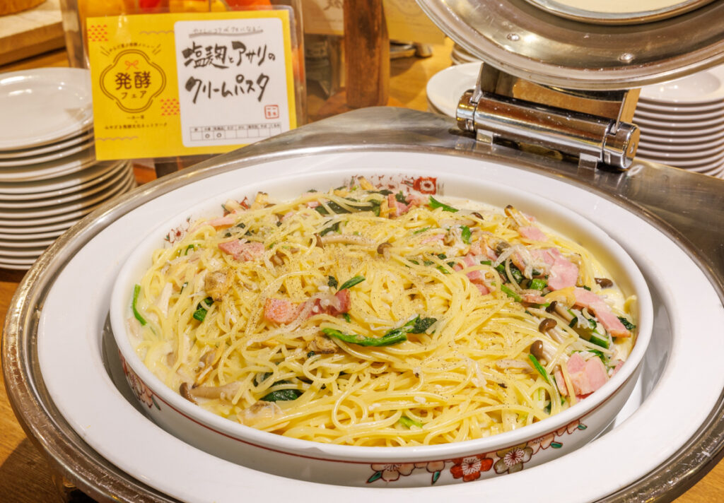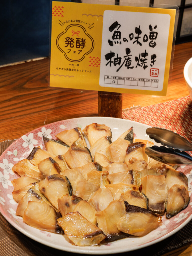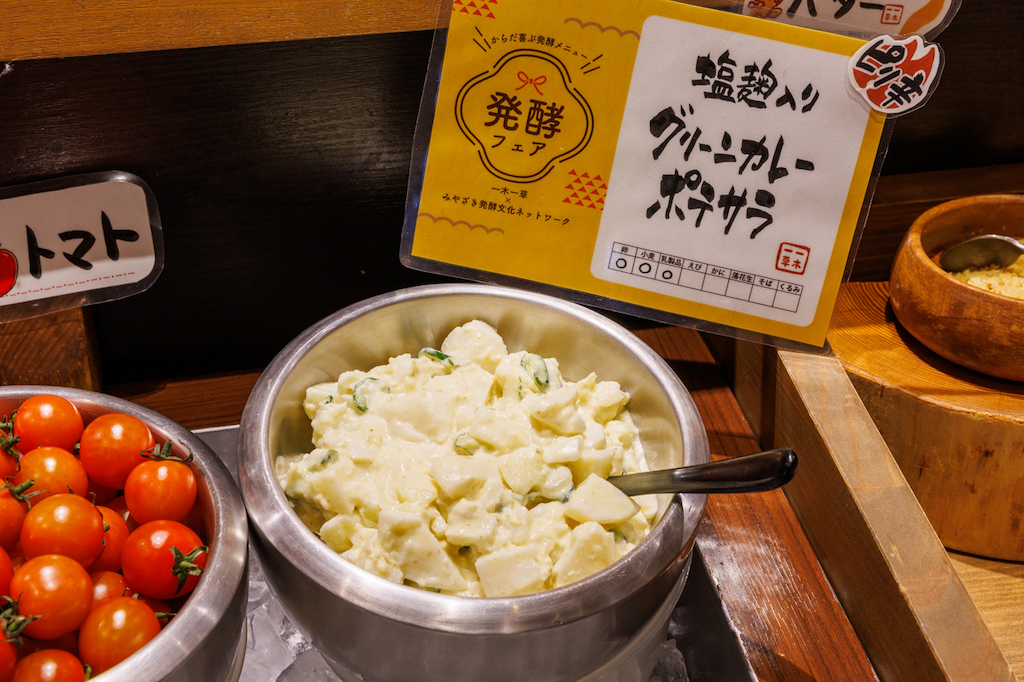 ごはん,酒, 地域活性, 発酵、食育、農業 宮崎観光ホテル一木一草(発酵フェア開催中) 2026年3月16日 / 宮崎観光ホテルのメインダイニング一木一草では みやざき発酵文化ネットワークと連携して発酵フェアを開催しています 今日は発酵メニューのご紹介をします まずは野菜サラダのコーナー 彩野菜を食べて腸活は健康の第一歩です さて野菜料理のコーナーには 肉料理は豚肉と白菜の塩麹チーズ焼き グラテン風で美味しいです! お魚料理は アルコールメニューも充実しています! パスタは塩麹のあさりのクリームパスタ まだまだ発酵メニューは盛りだくさんです ぜひ発酵フェア開催中の宮崎観光ホテル一木一草へお越しください!